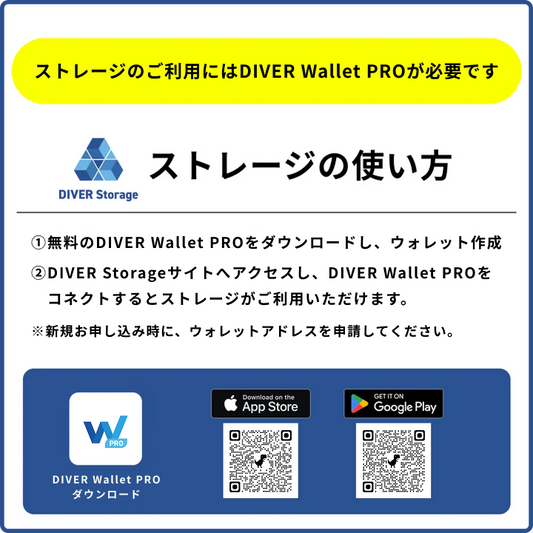 DIVER Wallet PROをダウンロードしてアカウントを作成し、下記のリンクDIVER Storageでコネクトするとストレージがご利用いただけます。